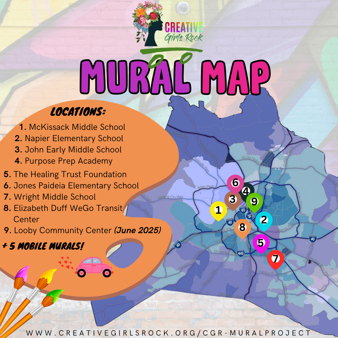 Creative Girls Rock invited all youth around the country (ages 6-18) to participate by selecting a flower to be incorporated in the CGR Mural design, originally displayed at Slim & Huskies Roll Out - 1006 Buchanan St, Nashville, TN 37208. Over 100 parents submitted and approved their youth’s name which were displayed in each flower on the Creative Girls Rock Legacy Mural.