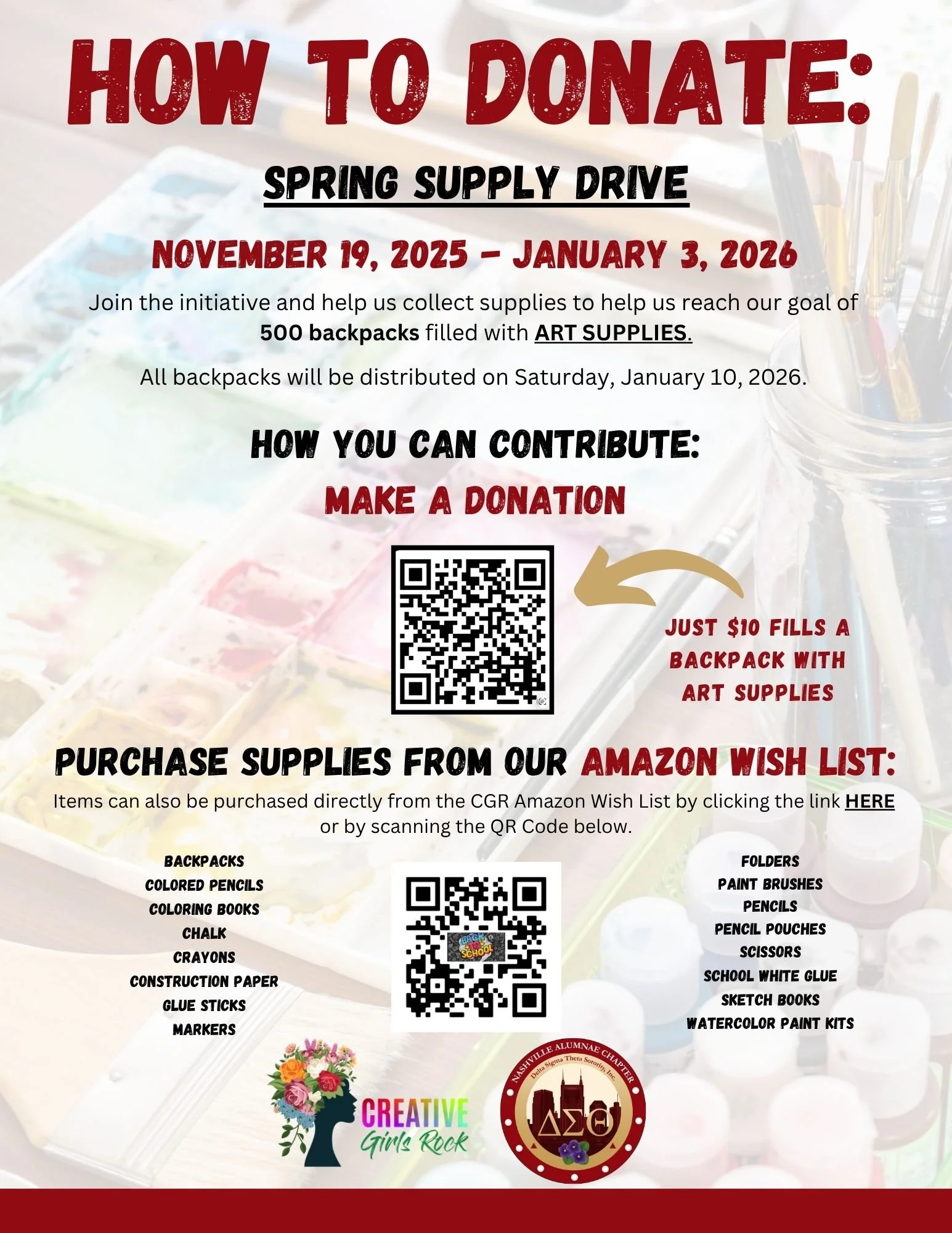 Creative Girls Rock®️ in partnership with the Nashville Alumnae Chapter of Delta Sigma Theta Sorority, Inc., will conduct a 2nd Semester Back-2-School Drive for school-aged students under our Youth Development initiative after the winter break.